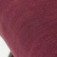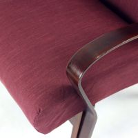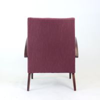 The piece has been newly upholstered in a rich, dark purple fabric with subtle orange accents, adding depth and character. The wooden frame has been carefully refinished in a deep dark oak tone, enhancing its elegant silhouette. Distinctive bentwood armrests—rarely seen in this form—lend the chair a refined and sculptural quality.