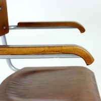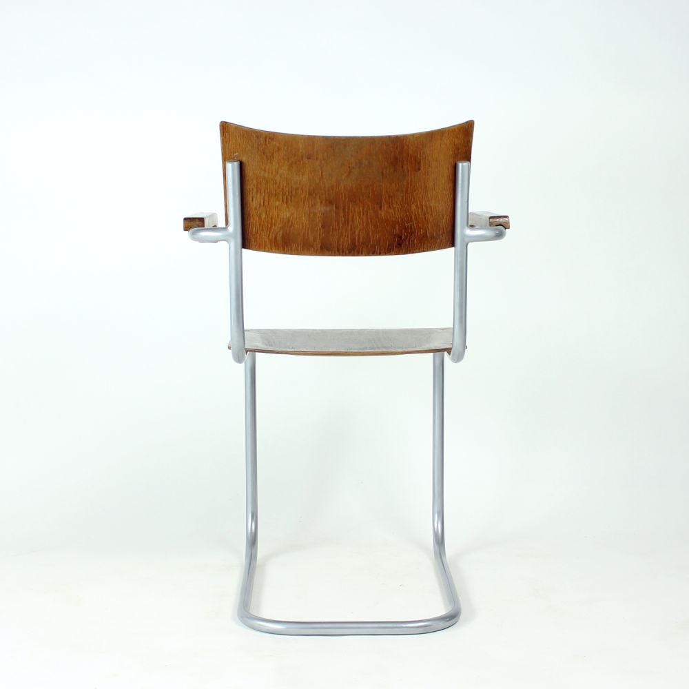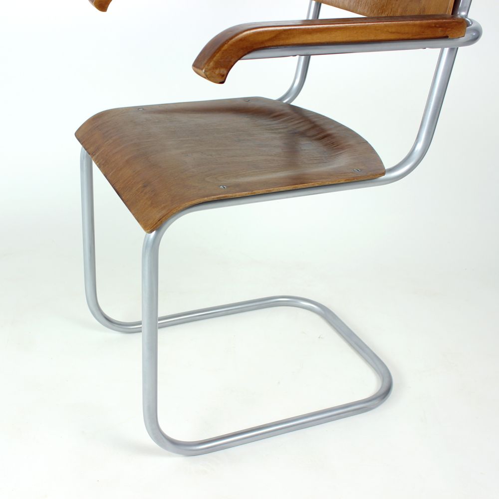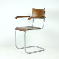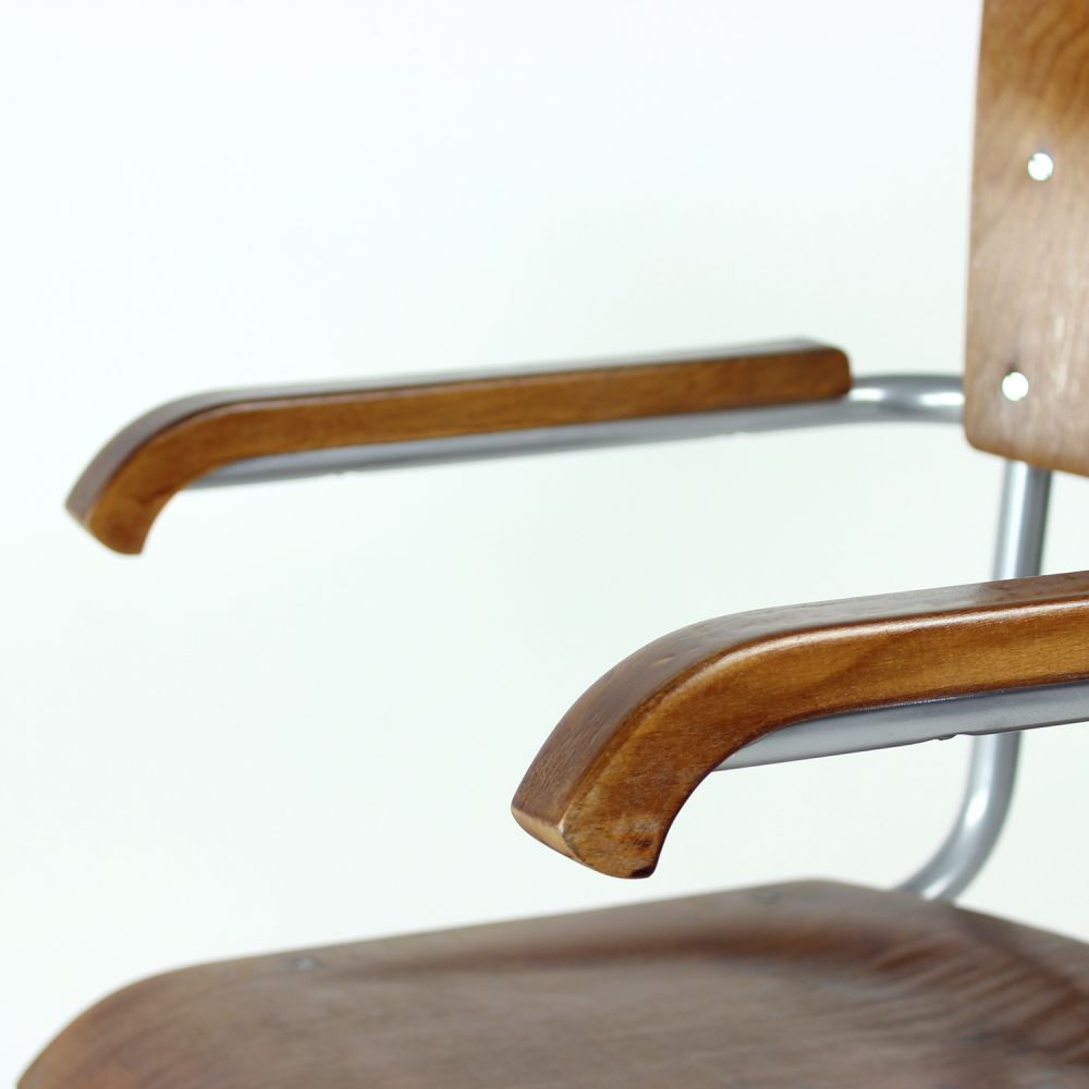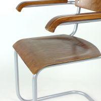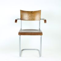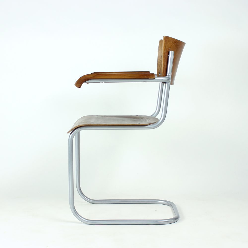 The chair features the characteristic tubular steel frame, embodying the functional elegance and structural innovation of early modernist design. The seat and backrest are formed from bent plywood, offering both comfort and a warm material contrast to the industrial frame.