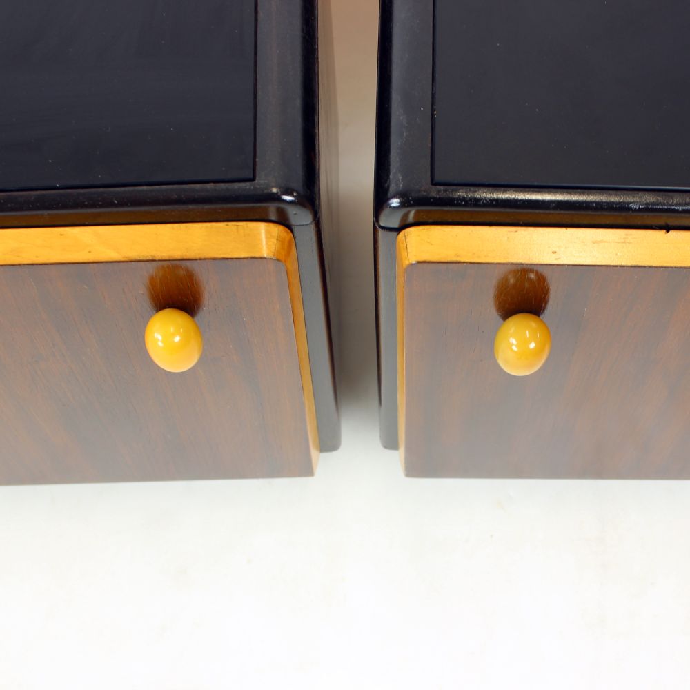 Crafted from wood and finished in a deep ebony stain (appearing almost black), the tables are complemented by original black opaline glass tops, adding a refined, architectural touch. The doors are mounted on piano hinges and feature elegant details—lightened edges, rich mahogany front panels, and original resin handles.