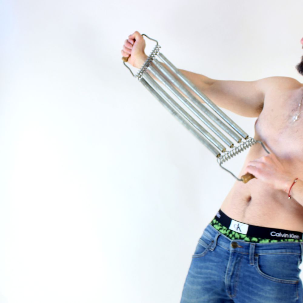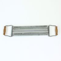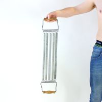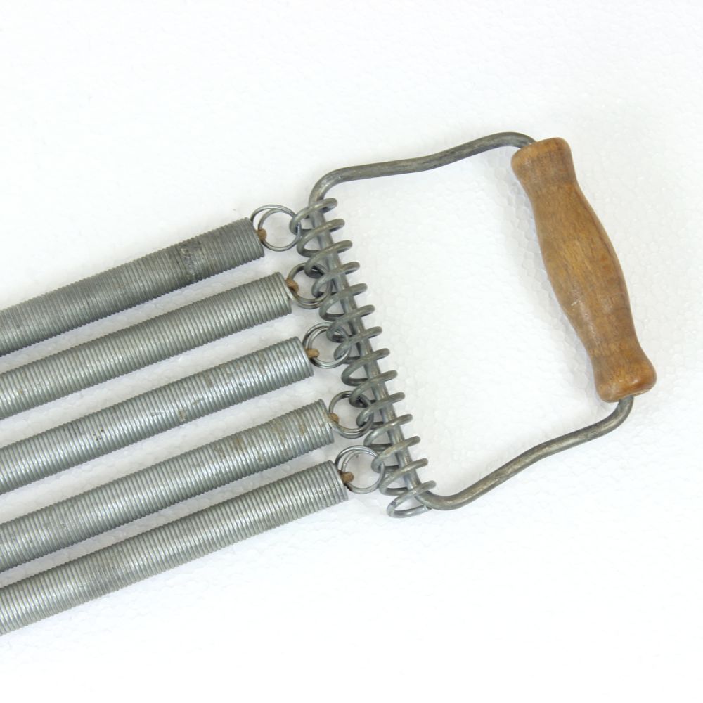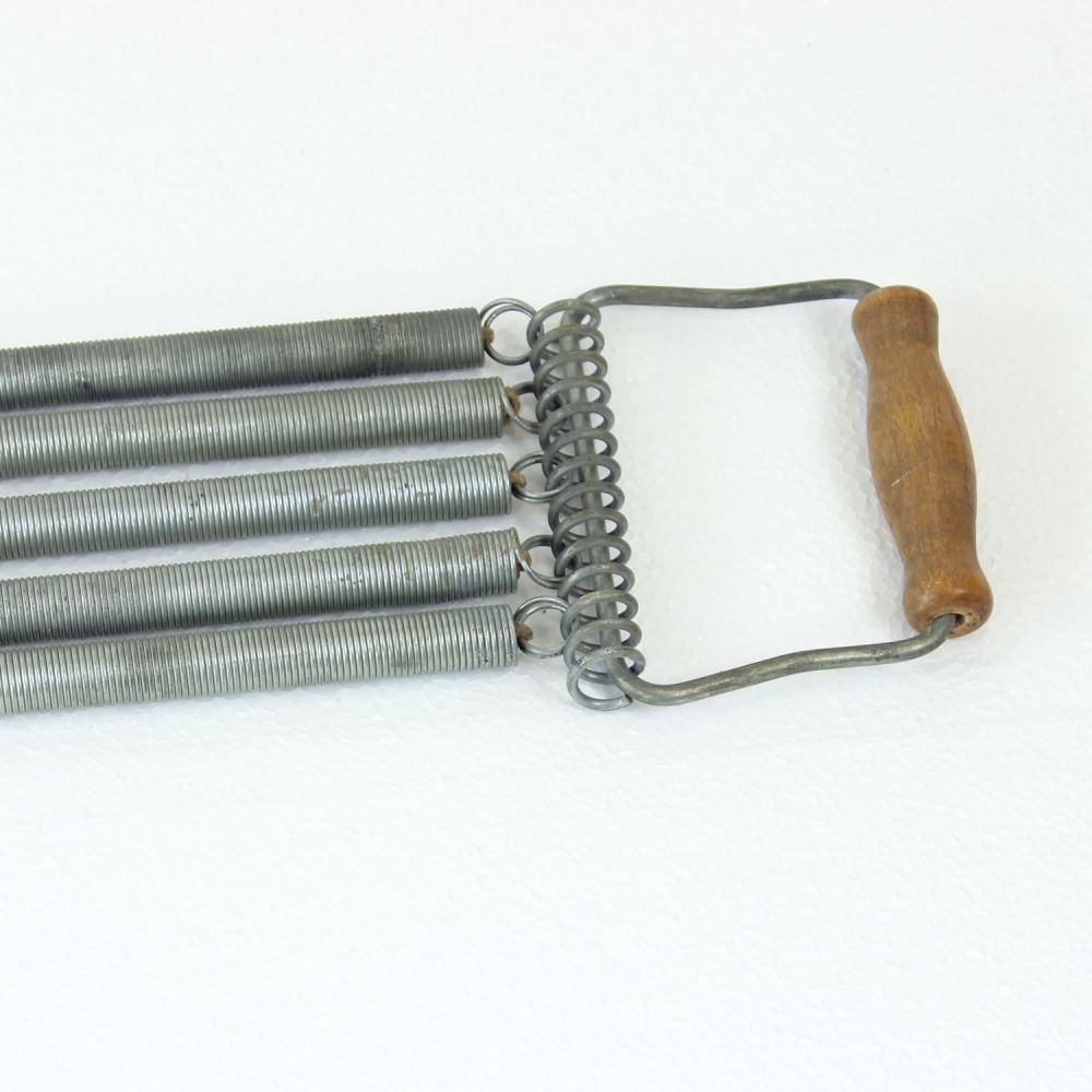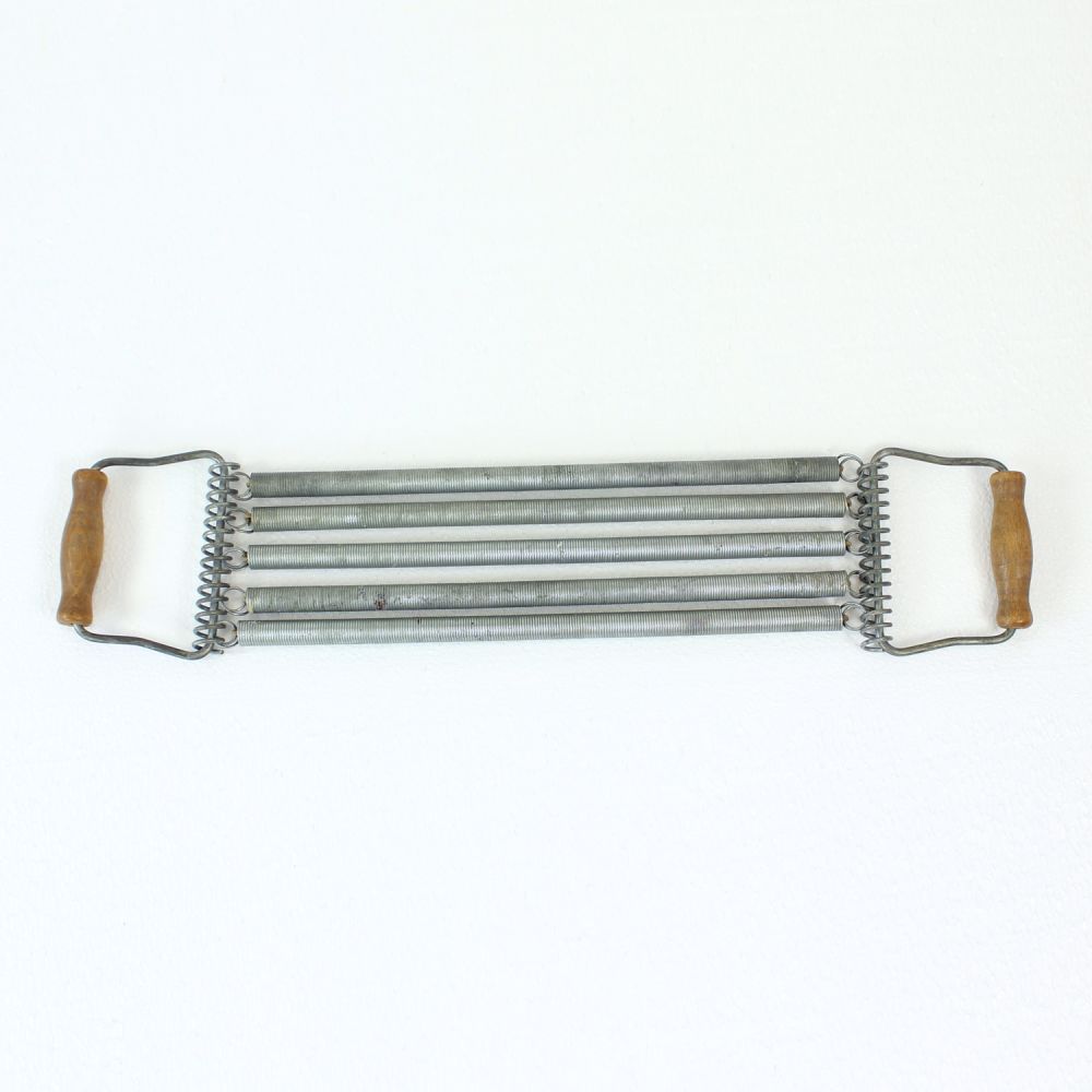 Constructed from coiled metal springs with solid wooden handles at each end, it offers substantial resistance and remains fully functional today. Beyond its original purpose, it stands as a characterful decorative object, bringing a touch of nostalgic charm and industrial heritage into contemporary interiors.